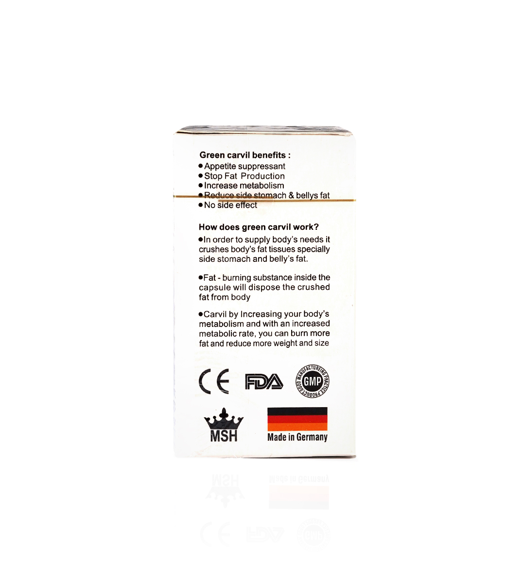 عدم استفاده از آمفتامین و ترکیبات شیمیایی لاغری در این قرص سبب شده است که با خیالی آسوده بتوانید آن را مصرف کنید. این مکمل آلمانی سوخت و ساز بدن را سرعت می دهد. با مصرف قرص لاغری آلمانی GC طلایی در یک ماه می توان بین ۵ تا ۹ کیلوگرم وزن خود را کاهش داد.
